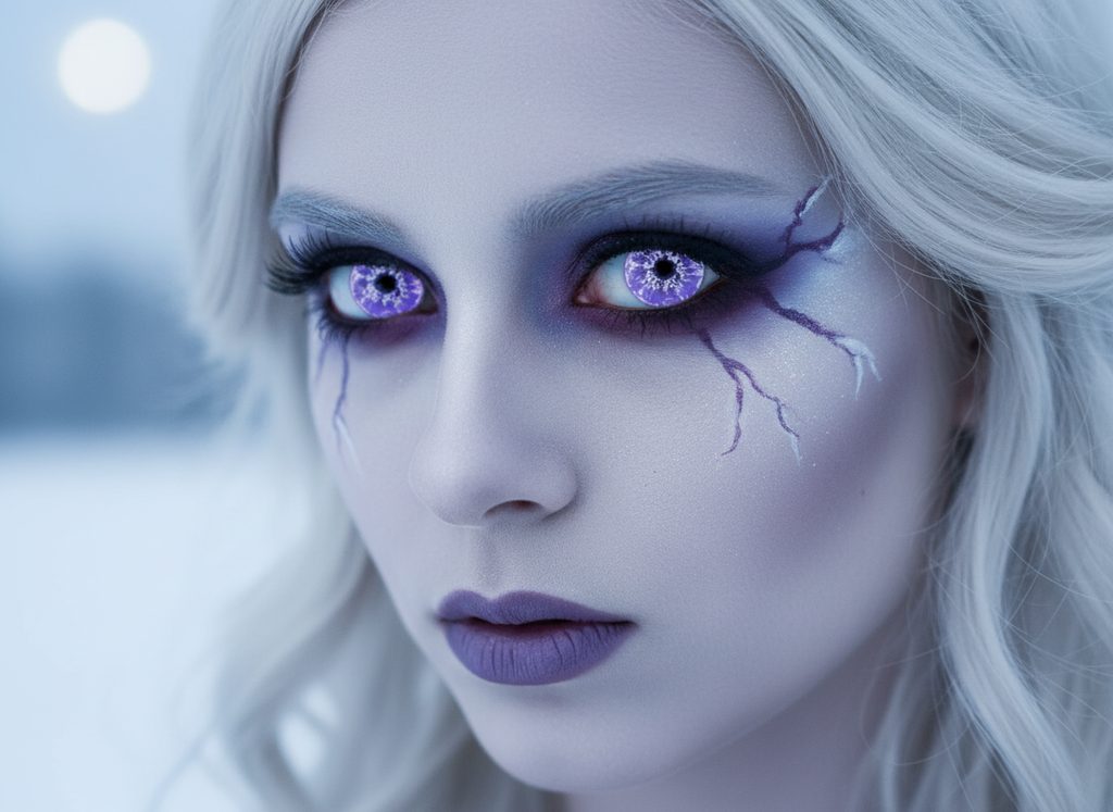 White Walker Violet: non-prescription coloured lenses featuring a chilling white and purple design inspired by iconic fantasy characters. They give your eyes a mysterious and eerie look, perfect for cosplay, Halloween, or horror makeup!